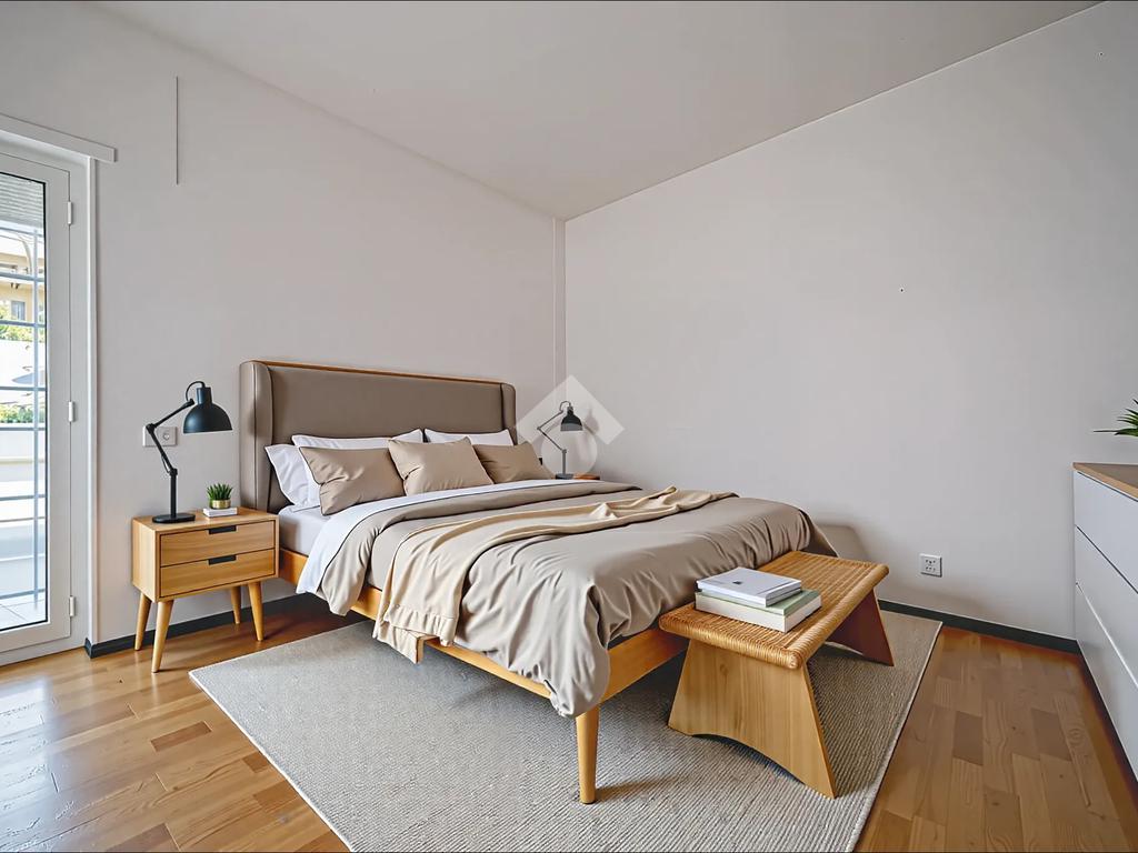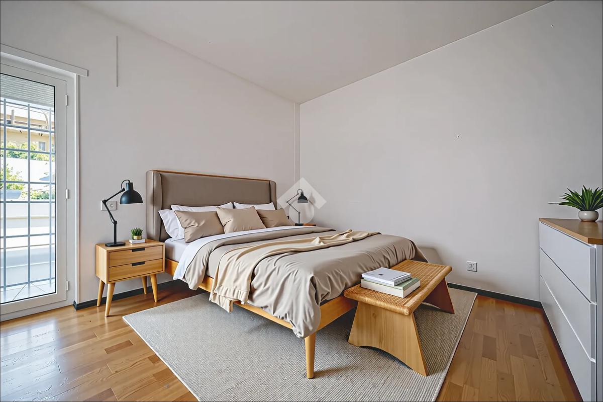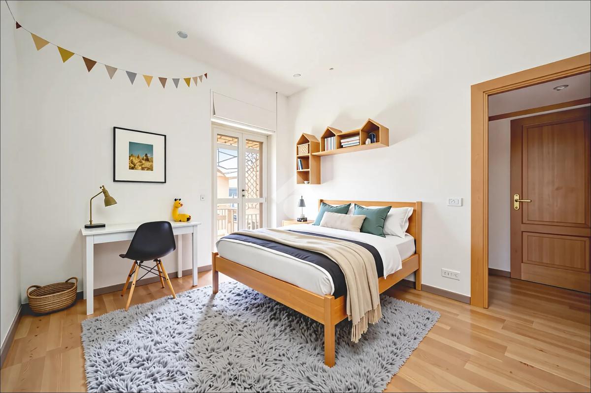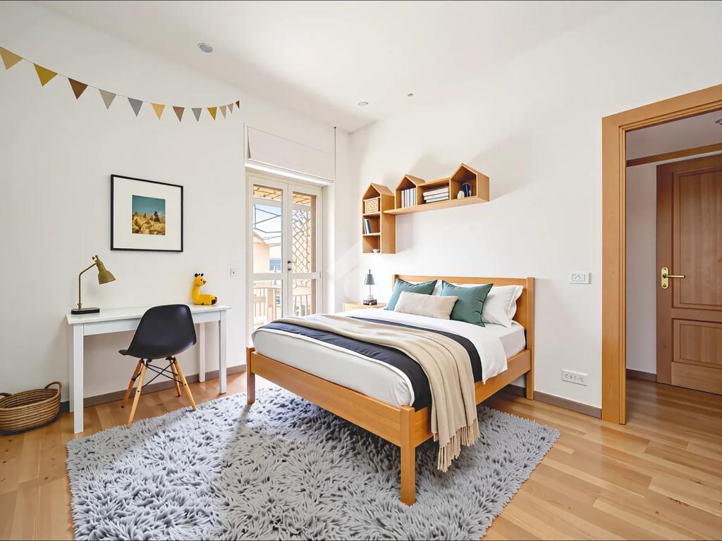 La zona notte è composta da due camere matrimoniali dalle dimensioni generose, entrambe ben illuminate e con accesso ai terrazzi. La prima può accogliere un letto matrimoniale, armadio a sei ante angolare e comò con angolo TV; la seconda, leggermente più contenuta, si presta sia come stanza per ragazzi che come studio con letto e armadio a ponte, questa molto luminosa grazie alla doppia esposizione angolare con due finestre e accesso al terrazzo.