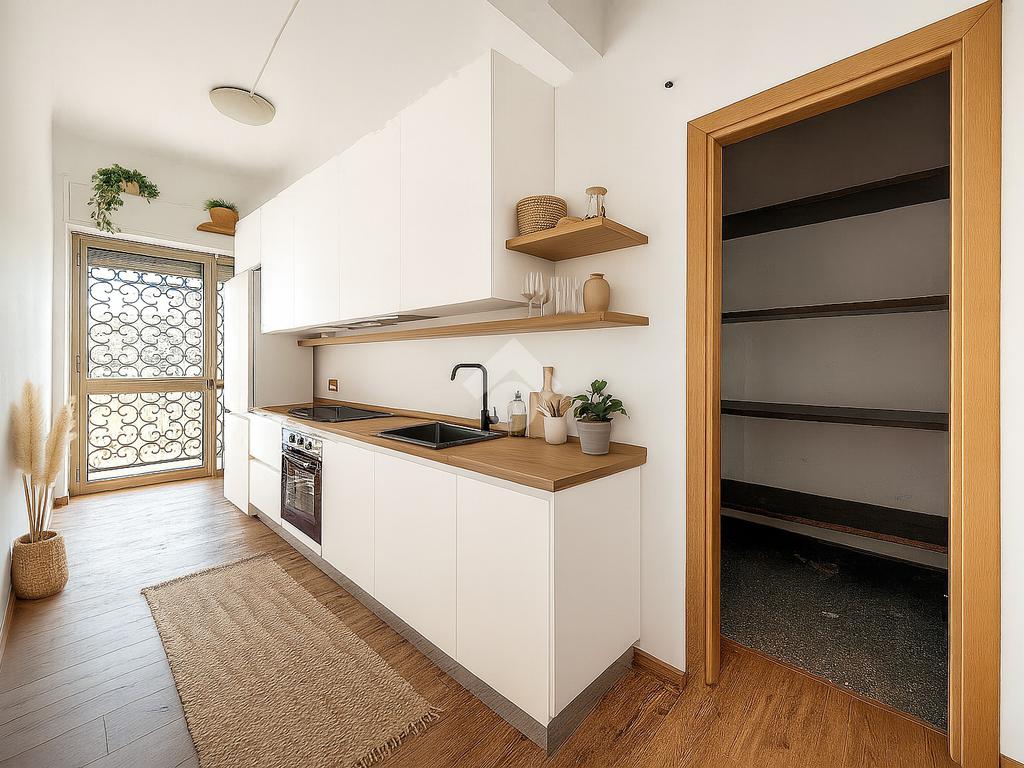Questa prima zona dell'appartamento, in fase di ristrutturazione, offre un'interessante opportunità: demolendo le tramezzature interne si può ottenere un unico open space di circa 50 mq, moderno e funzionale.