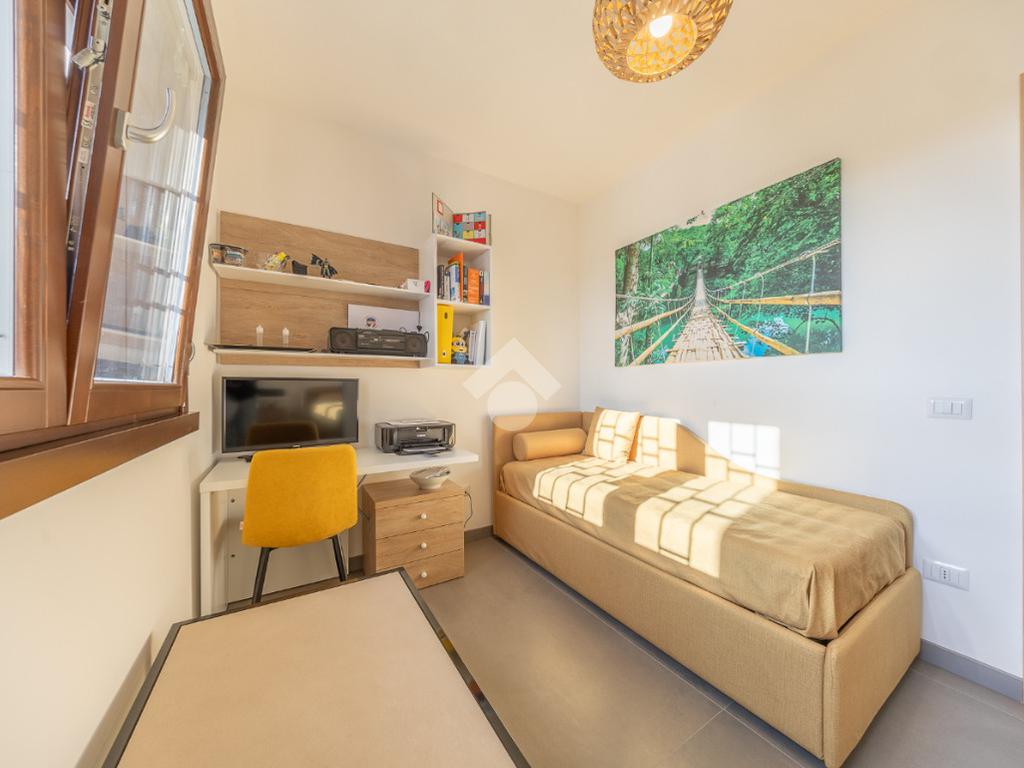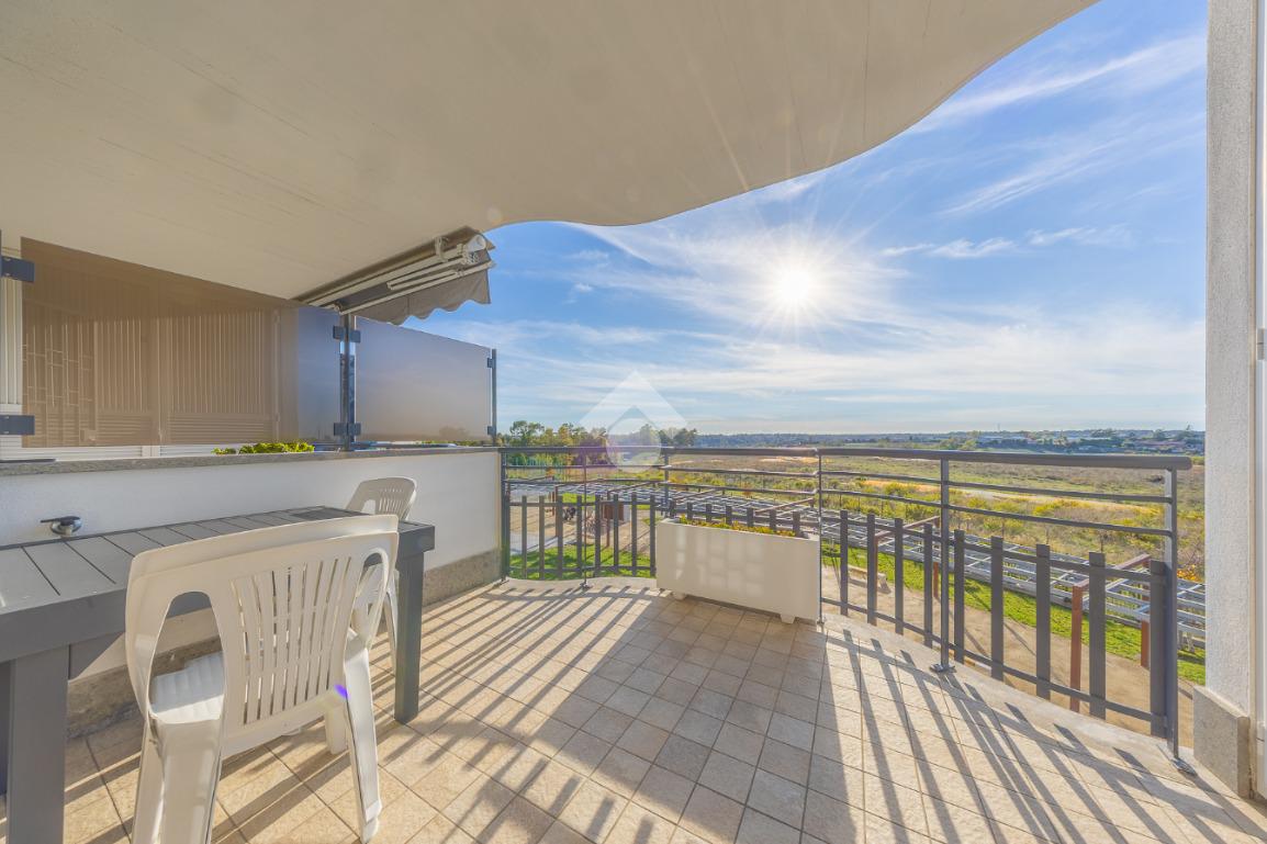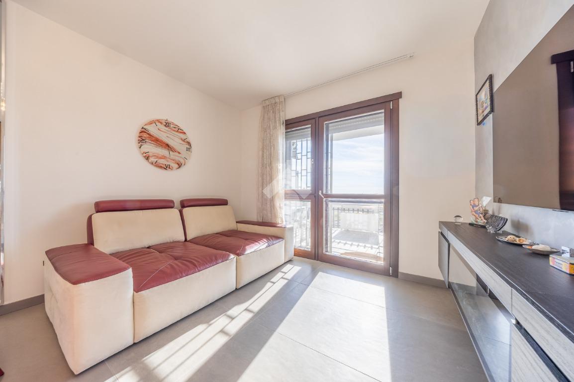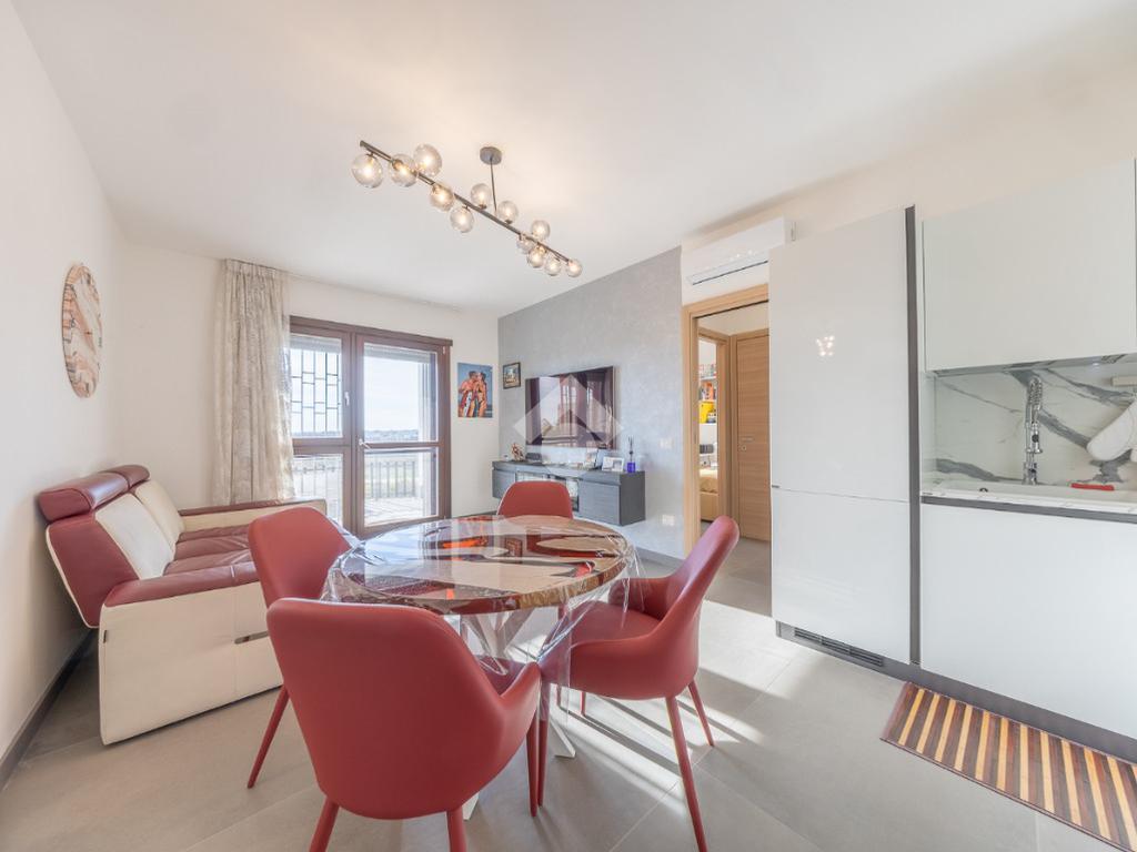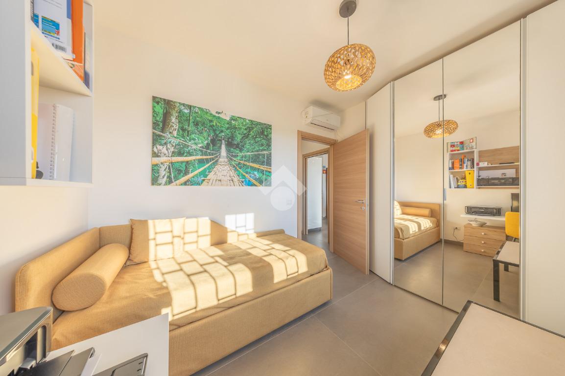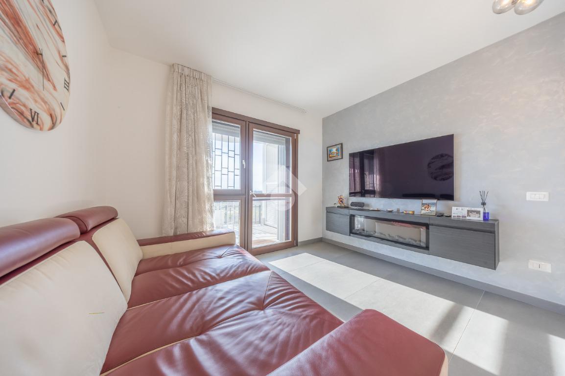 La zona giorno si apre su un accogliente soggiorno con angolo cottura, perfettamente integrato e progettato per ottimizzare gli spazi. La presenza di una grande porta finestra consente l’accesso al primo spazio esterno abitabile, esposto ad ovest, che regala luce naturale durante tutto il pomeriggio e una piacevole vista libera sul contesto circostante. L’ambiente, caldo e contemporaneo, si distingue per le finiture di qualità, la pavimentazione in grès porcellanato e i serramenti in legno con doppio vetro camera, dotati di inferriate, zanzariere e avvolgibili elettrici, a conferma di un’attenzione al comfort e alla sicurezza domestica.