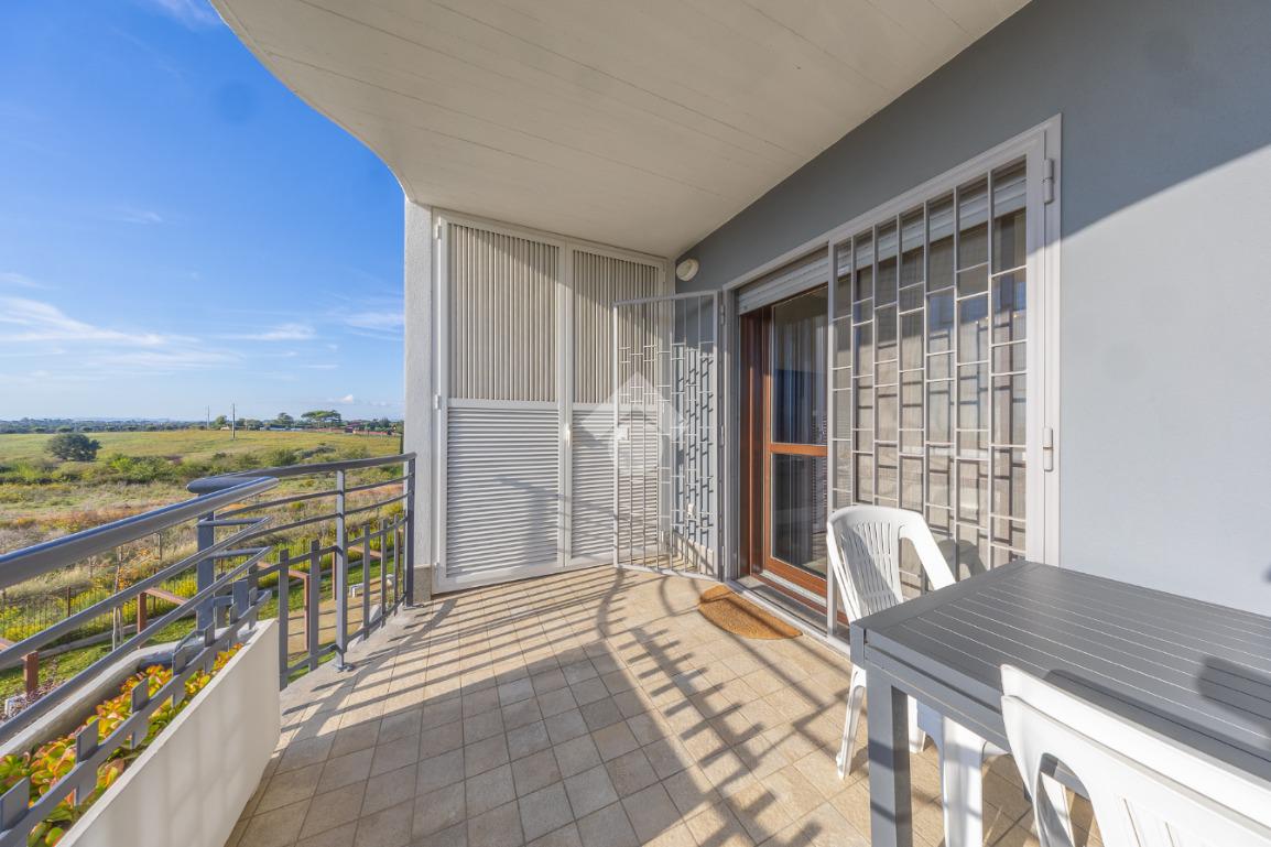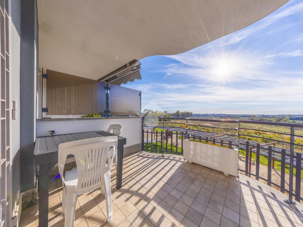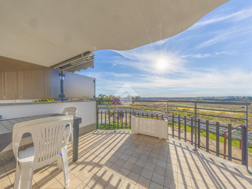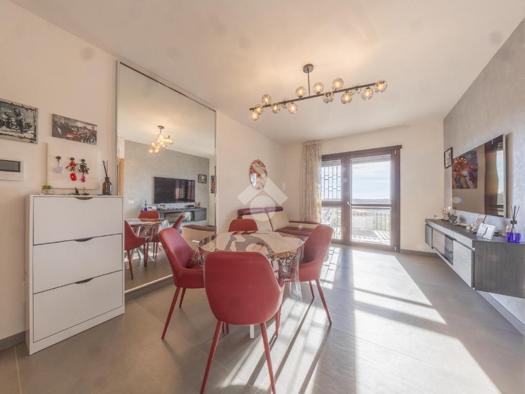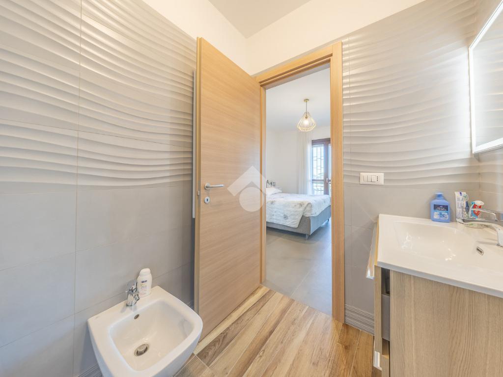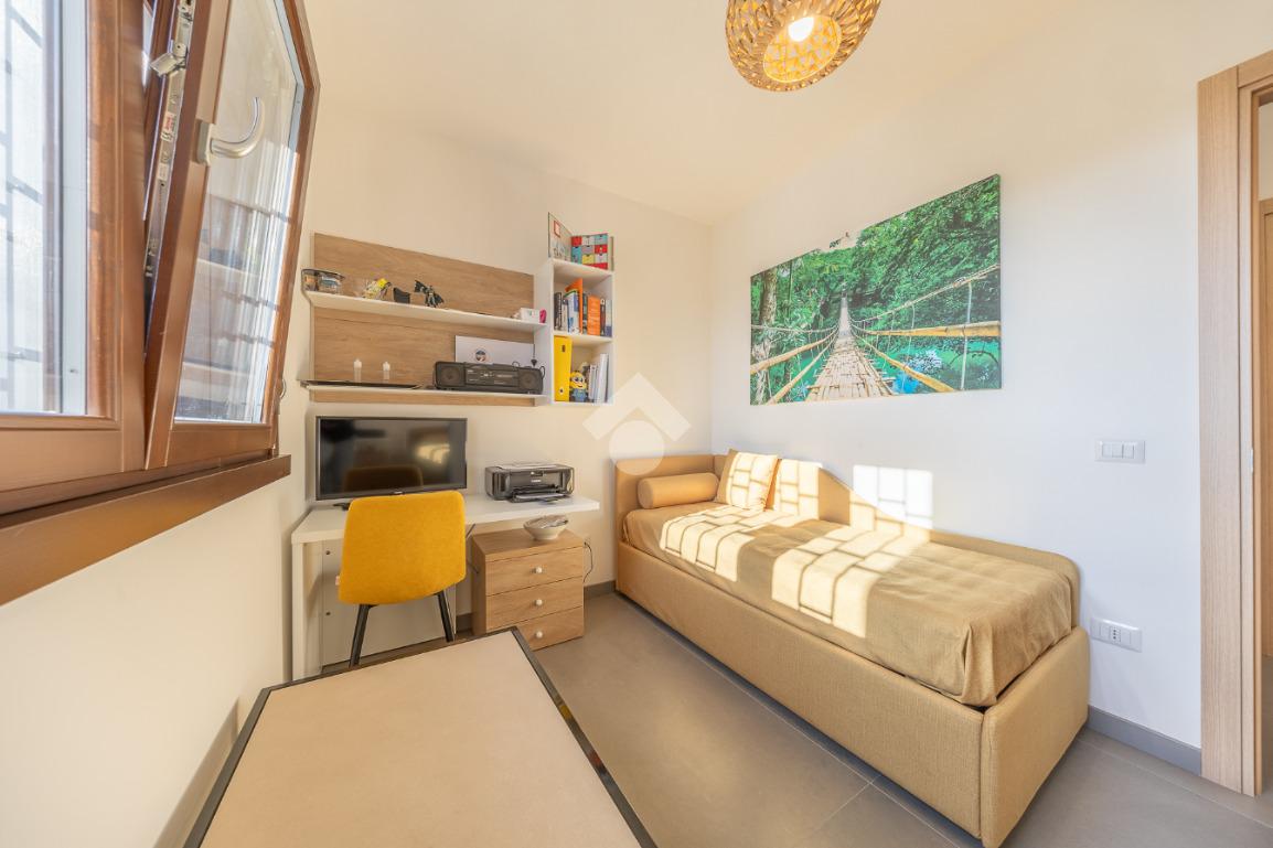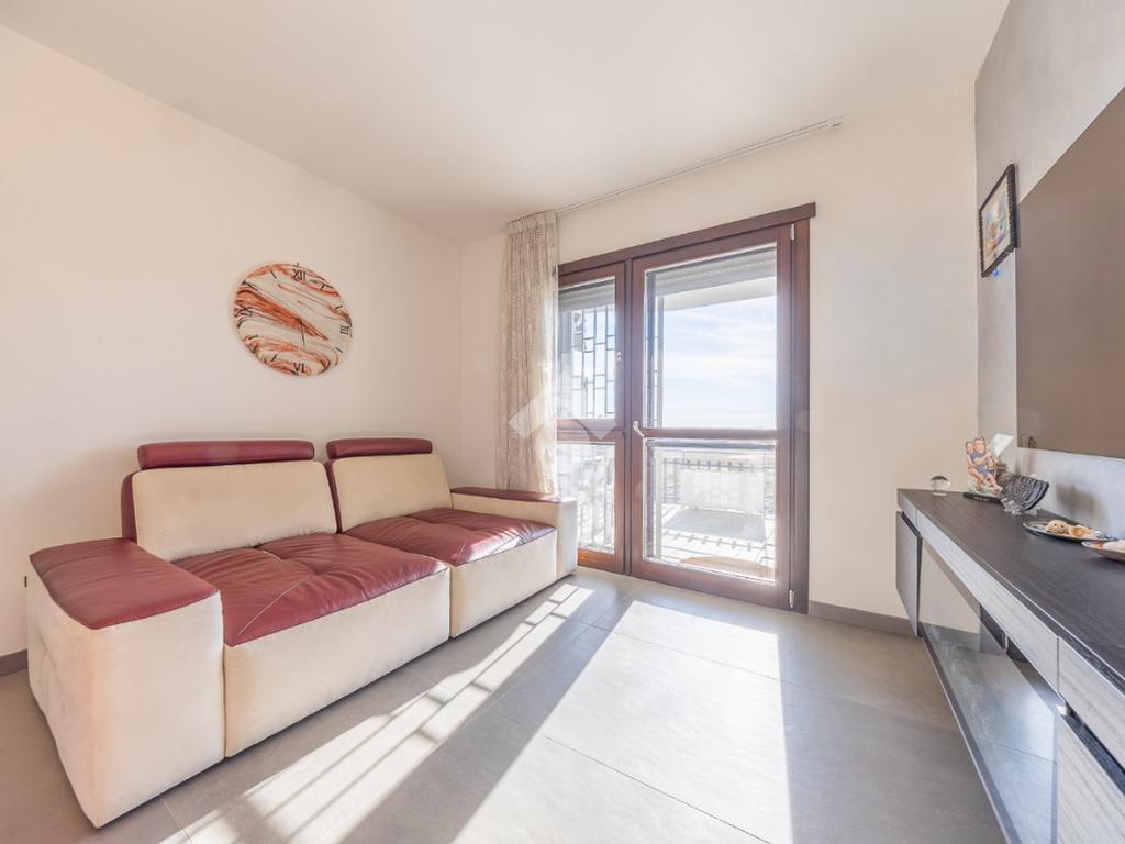 La zona giorno si apre su un accogliente soggiorno con angolo cottura, perfettamente integrato e progettato per ottimizzare gli spazi. La presenza di una grande porta finestra consente l’accesso al primo spazio esterno abitabile, esposto ad ovest, che regala luce naturale durante tutto il pomeriggio e una piacevole vista libera sul contesto circostante. L’ambiente, caldo e contemporaneo, si distingue per le finiture di qualità, la pavimentazione in grès porcellanato e i serramenti in legno con doppio vetro camera, dotati di inferriate, zanzariere e avvolgibili elettrici, a conferma di un’attenzione al comfort e alla sicurezza domestica.