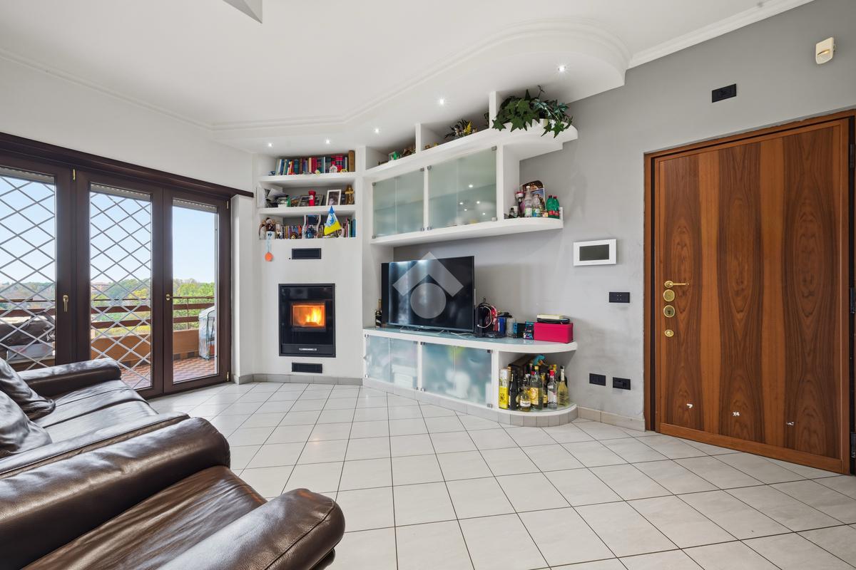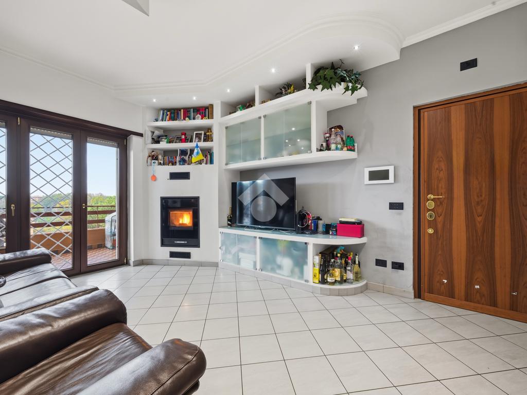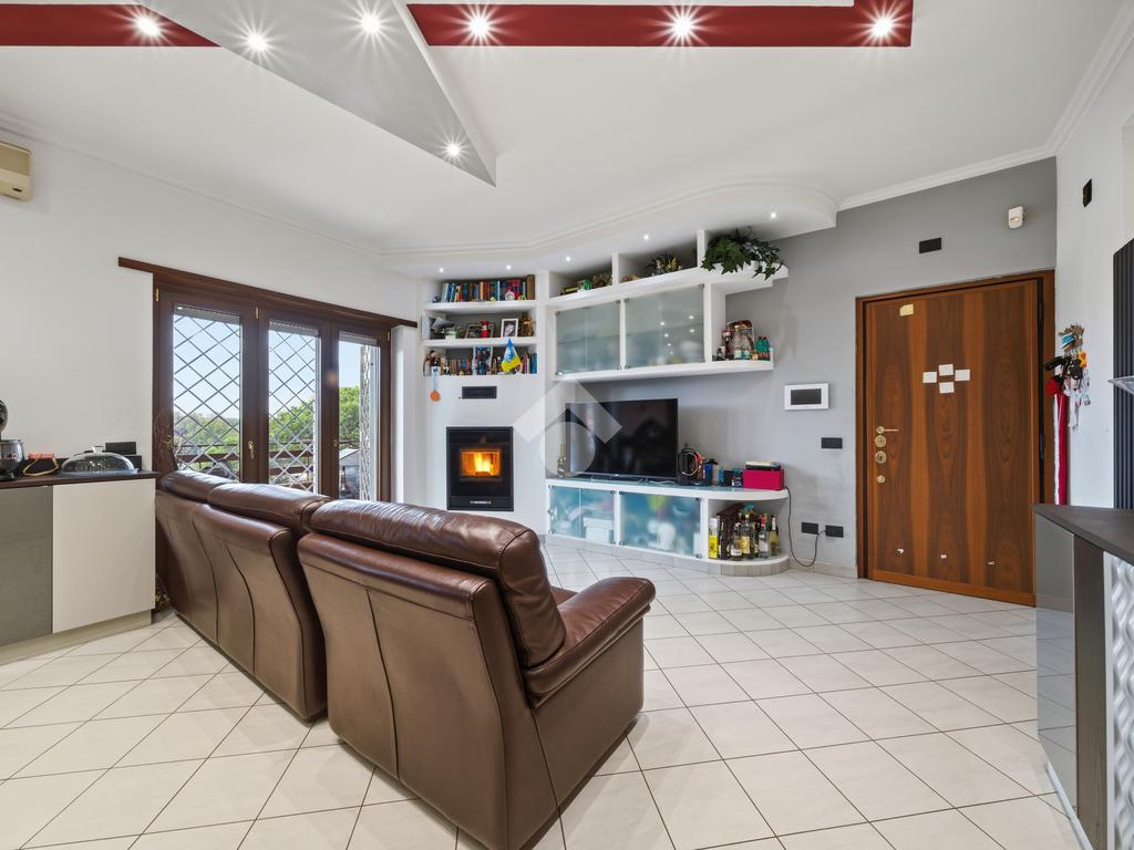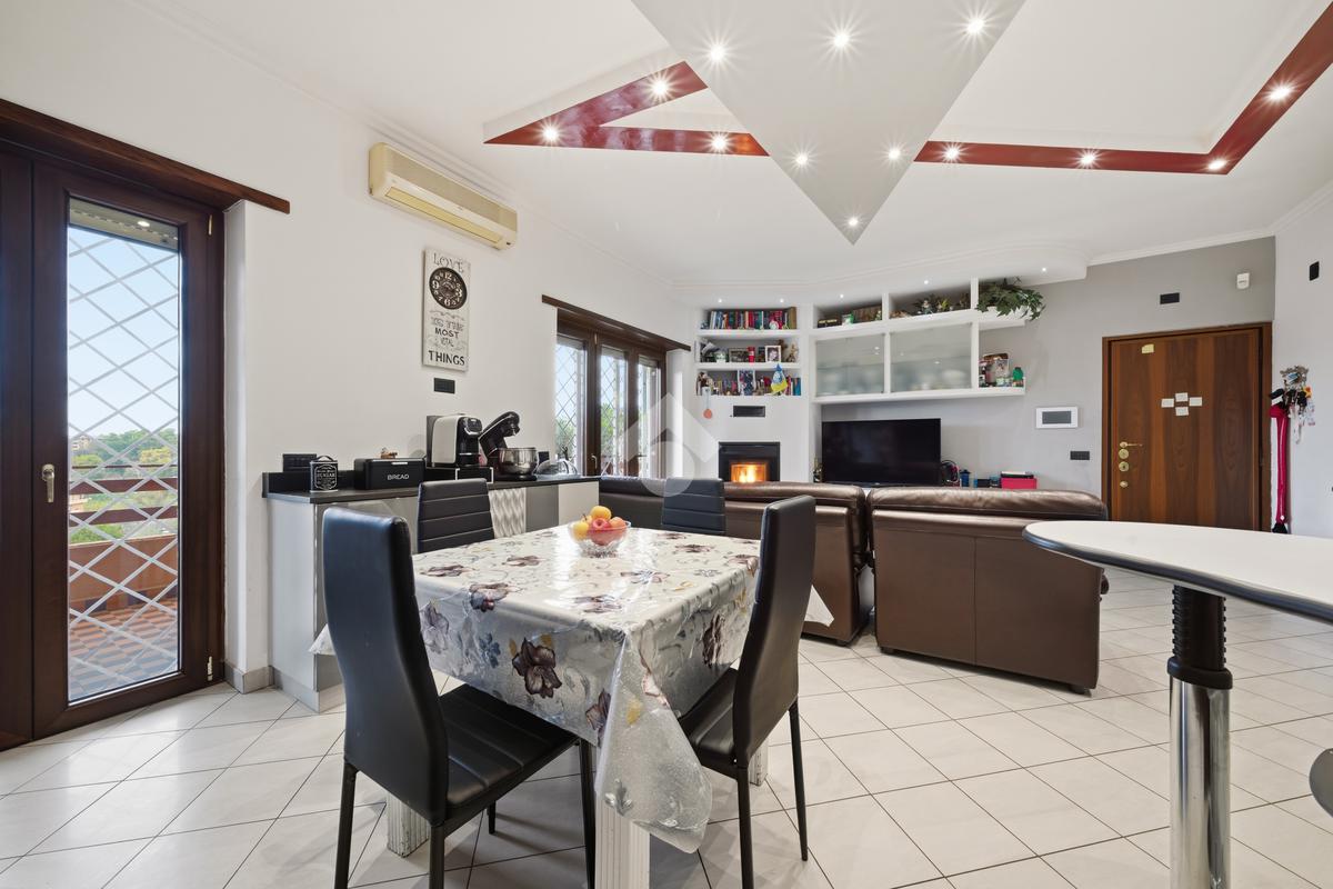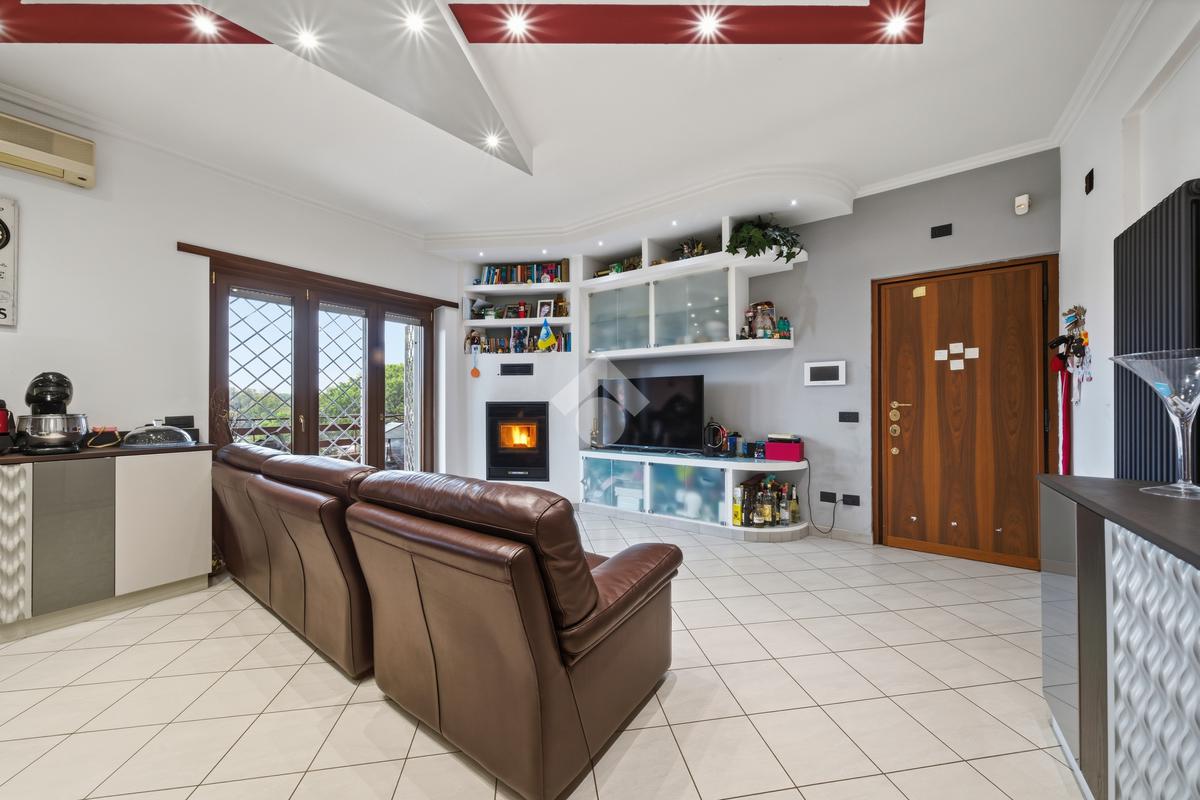 Il salone con angolo cottura è stato concepito per garantire una perfetta vivibilità quotidiana: da un lato la zona pranzo, comoda e ben definita, dall’altro l’area relax con divano, termocamino, e parete attrezzata, pensata per momenti di convivialità. Da questa zona si accede al balcone che percorre l’intero fronte dell’abitazione, uno spazio ideale per pranzi all’aperto o per godersi la tranquillità del contesto circostante.