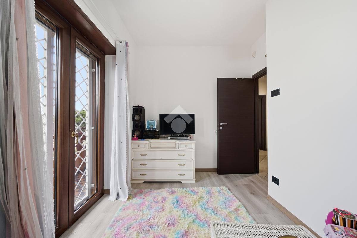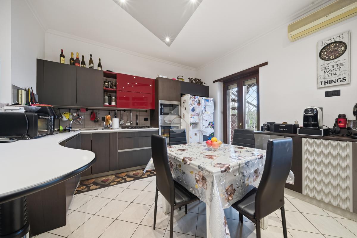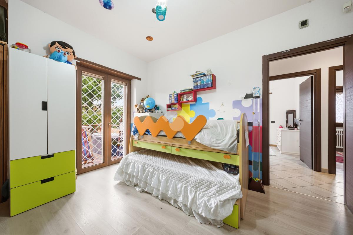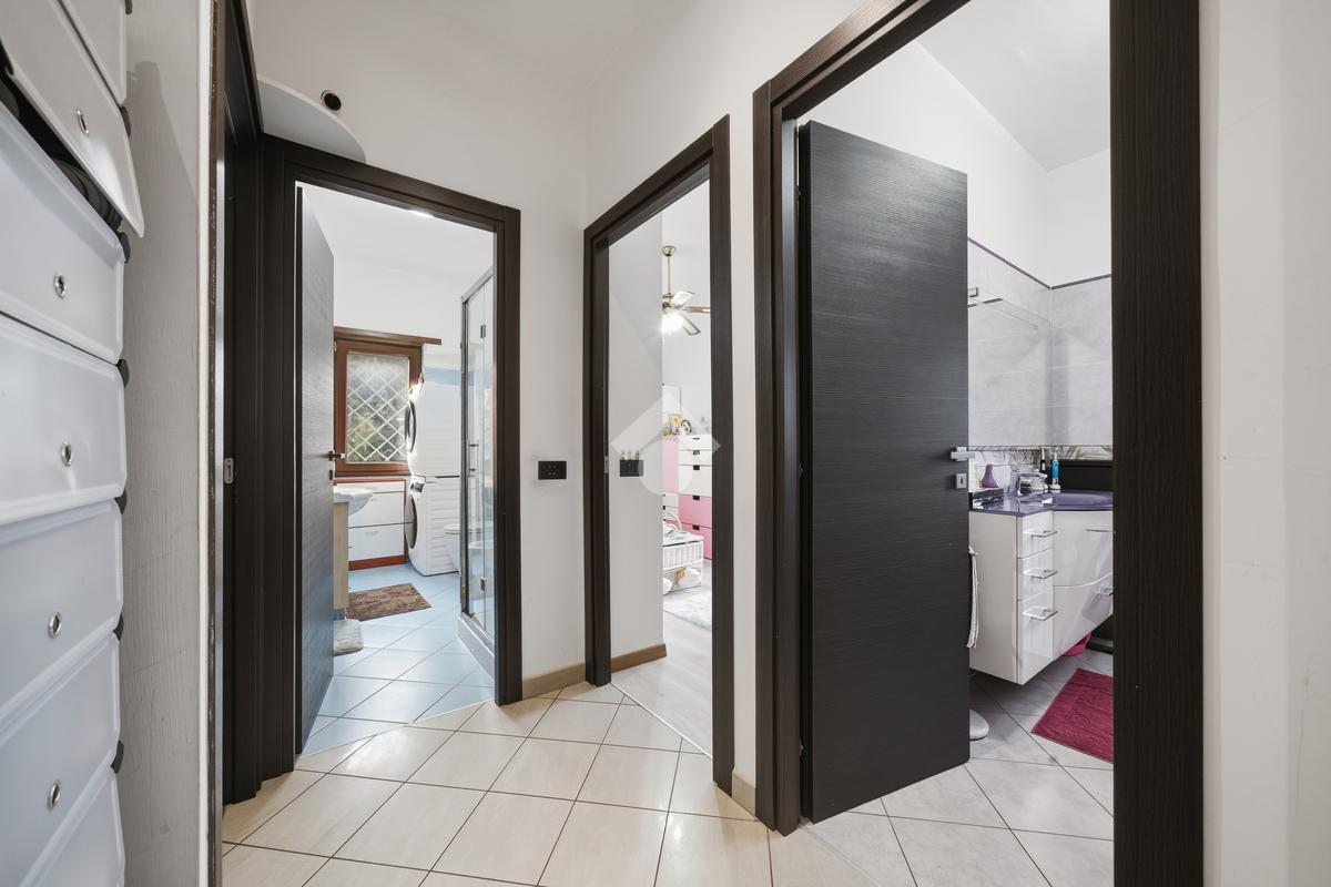 Il salone con angolo cottura è stato concepito per garantire una perfetta vivibilità quotidiana: da un lato la zona pranzo, comoda e ben definita, dall’altro l’area relax con divano, termocamino, e parete attrezzata, pensata per momenti di convivialità. Da questa zona si accede al balcone che percorre l’intero fronte dell’abitazione, uno spazio ideale per pranzi all’aperto o per godersi la tranquillità del contesto circostante.
