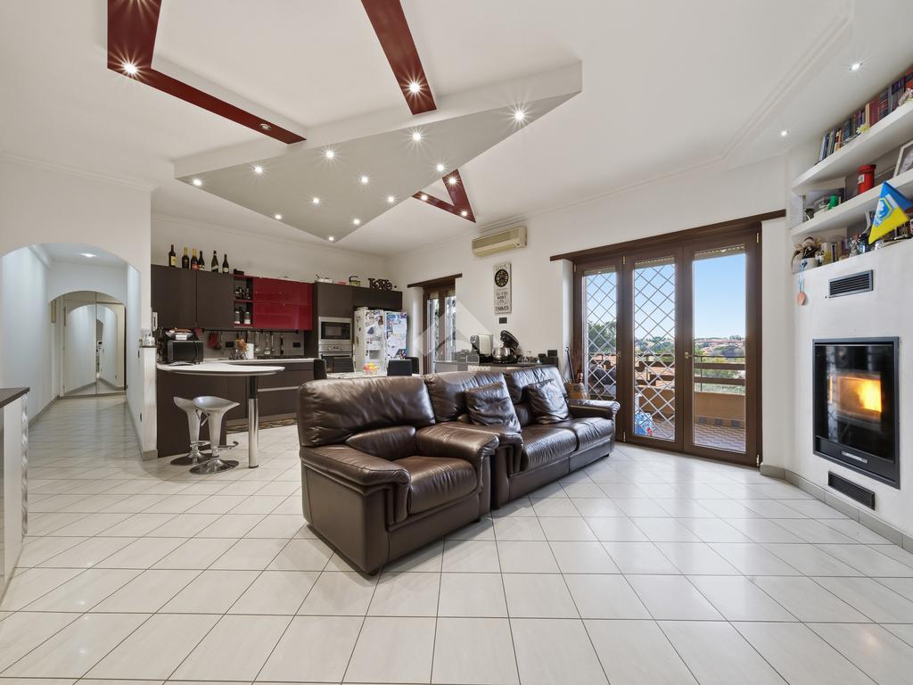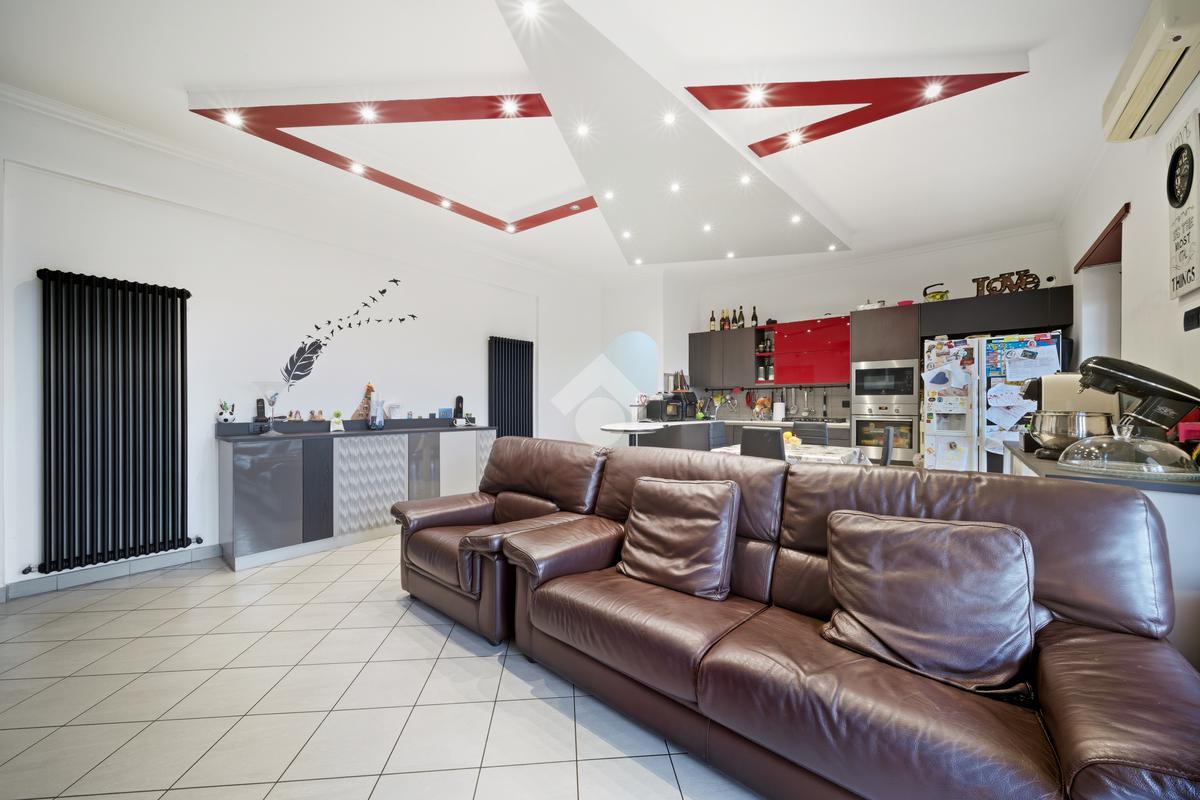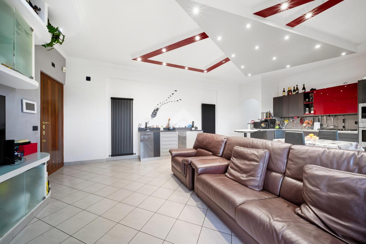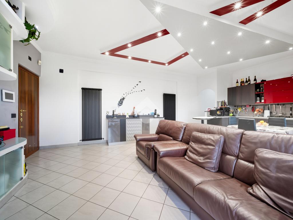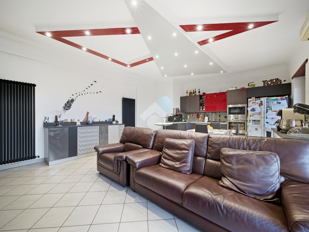 L’appartamento, posto all’ultimo piano e completamente ristrutturato, offre una metratura complessiva di 132 mq. L’ingresso introduce in una zona giorno moderno e accogliente, impreziosito da un elegante controsoffitto con faretti che crea un gioco di profondità e luce.