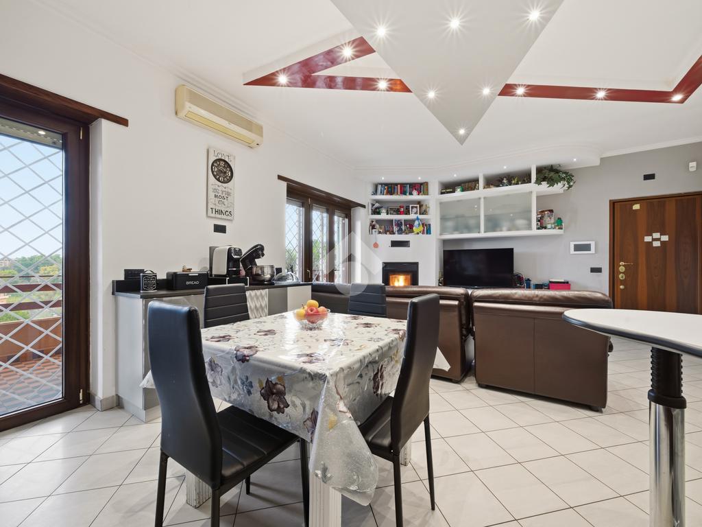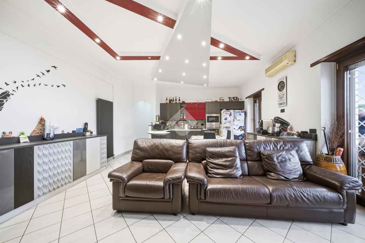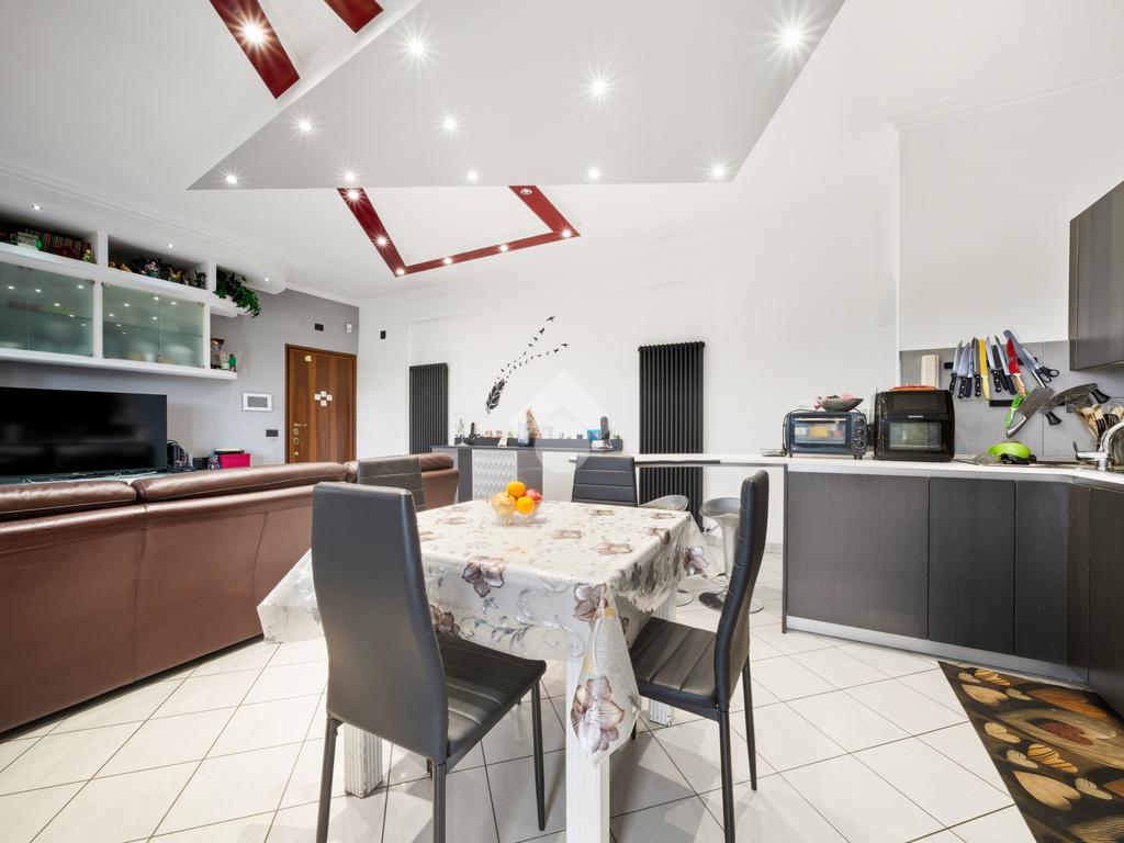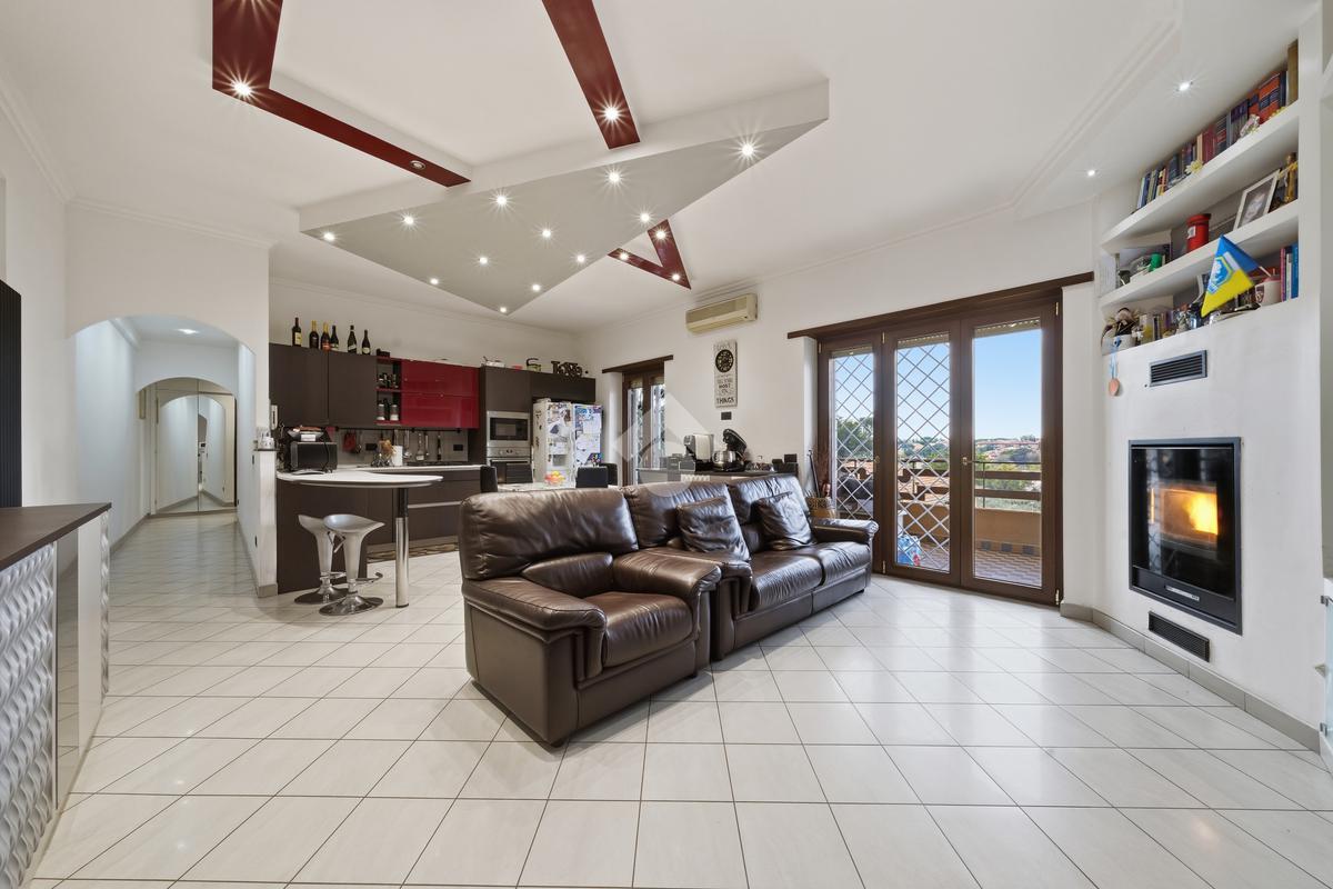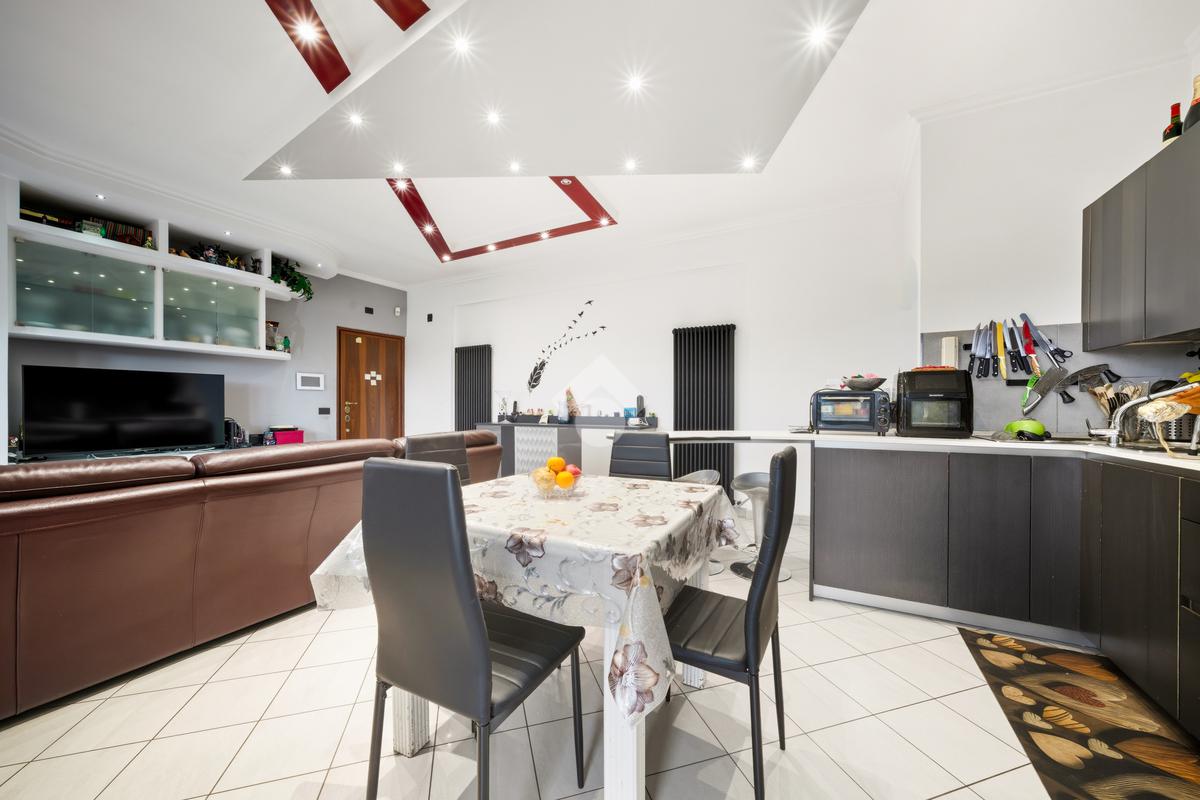 L’appartamento, posto all’ultimo piano e completamente ristrutturato, offre una metratura complessiva di 132 mq. L’ingresso introduce in una zona giorno moderno e accogliente, impreziosito da un elegante controsoffitto con faretti che crea un gioco di profondità e luce.