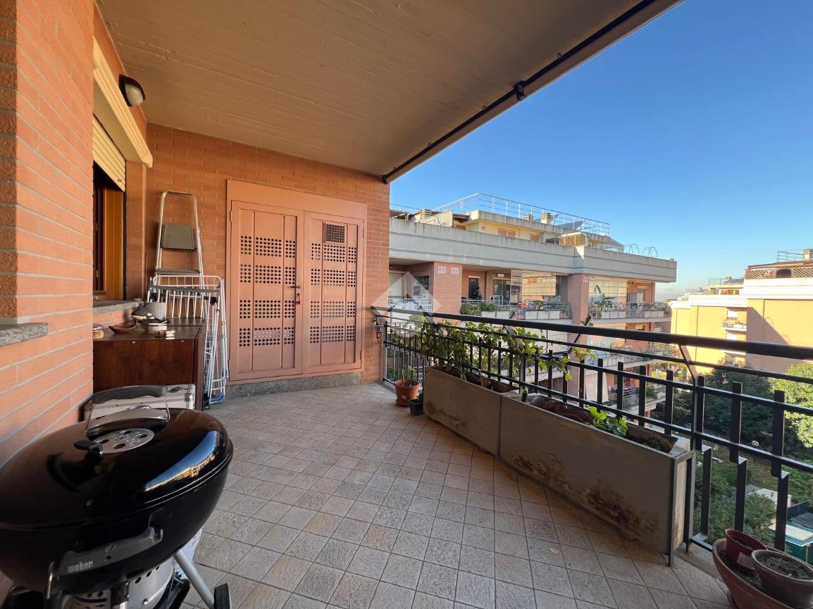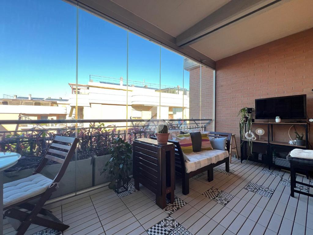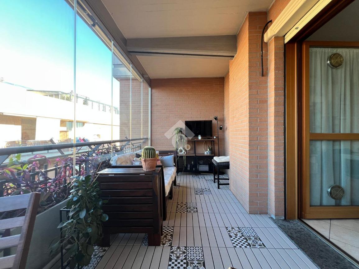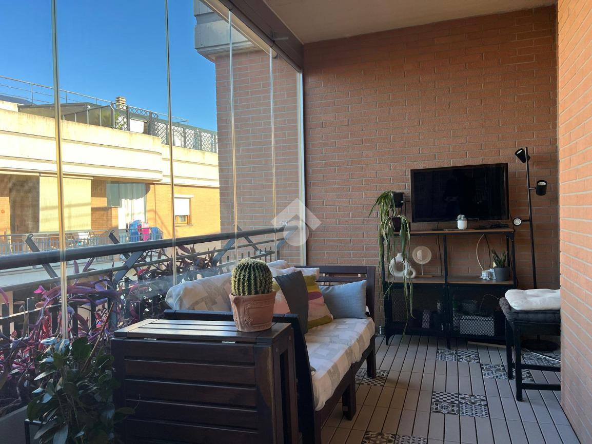 Da qui si accede al primo spazio esterno, un balcone abitabile con affaccio tranquillo sul giardino condominiale interno. Questo ambiente è stato ulteriormente valorizzato grazie alla recente installazione di vetri a scomparsa, una soluzione che consente di ampliare la fruibilità del terrazzo durante tutto l’anno. La possibilità di chiudere completamente lo spazio mantiene un ottimo livello di luminosità e offre un proseguimento naturale della zona giorno.