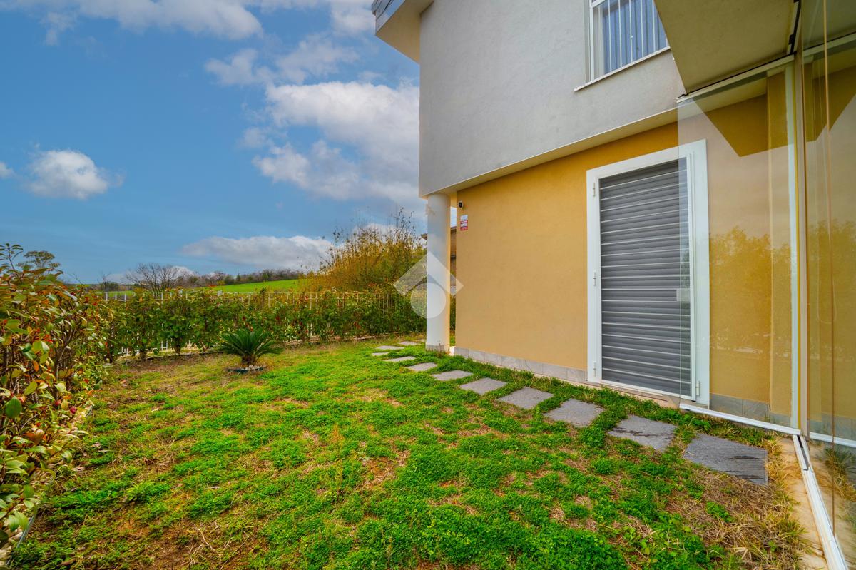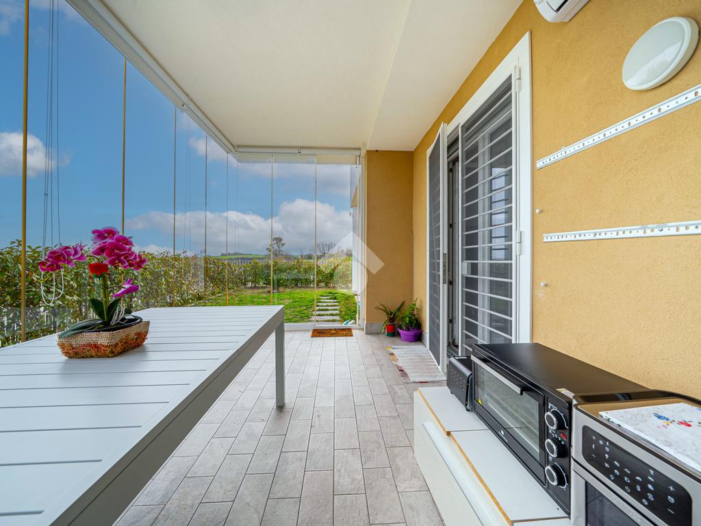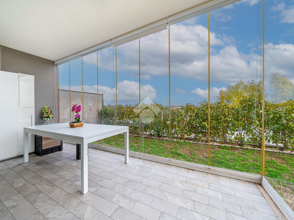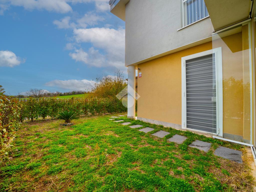 Inserito all’interno di un comparto curato e ordinato, l’accesso avviene sia tramite ingresso pedonale che carrabile. L’appartamento, posto al piano terra, gode di un’esposizione angolare libera ad est e sud, che assicura luminosità costante durante tutto l’arco della giornata e gradevoli affacci panoramici.