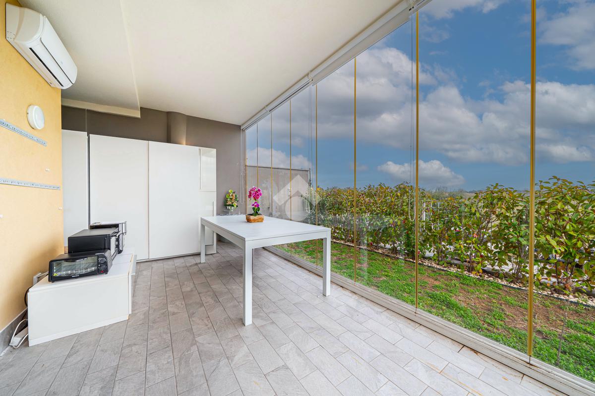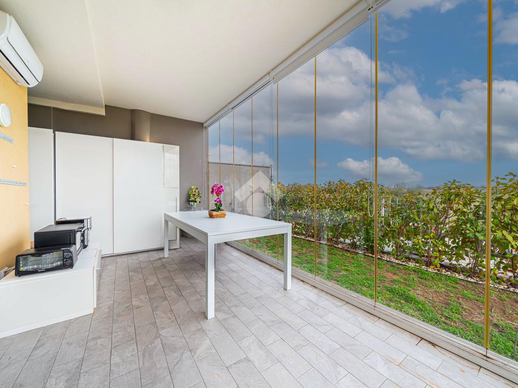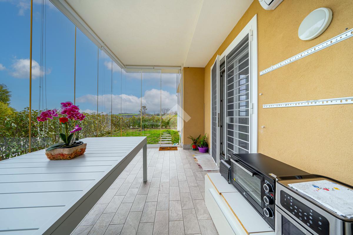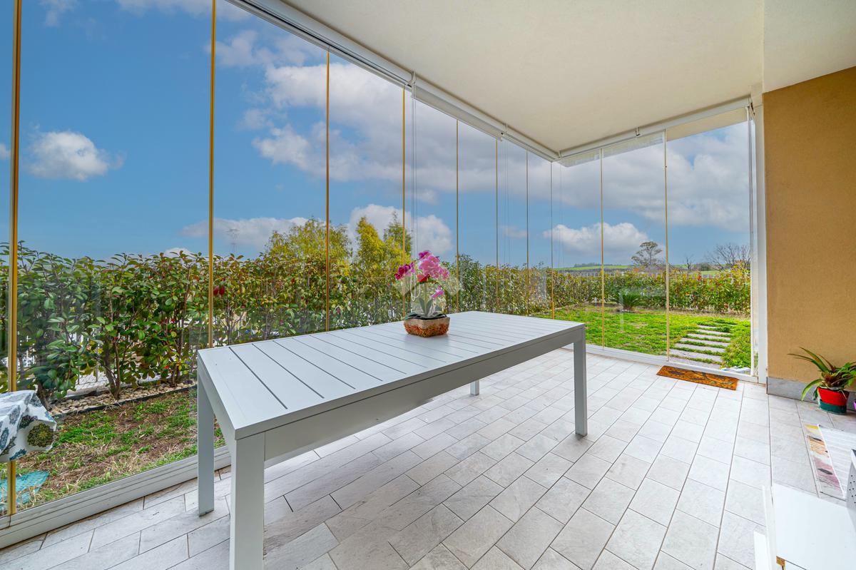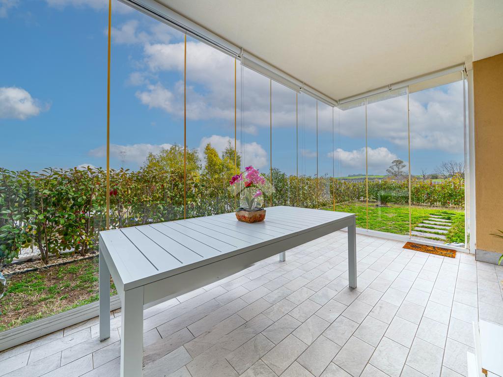 La presenza di un portico chiuso con vetrata scorrevole rappresenta un naturale prolungamento della zona giorno, creando uno spazio versatile e fruibile in ogni stagione, ideale come area relax, zona pranzo aggiuntiva o ambiente conviviale.